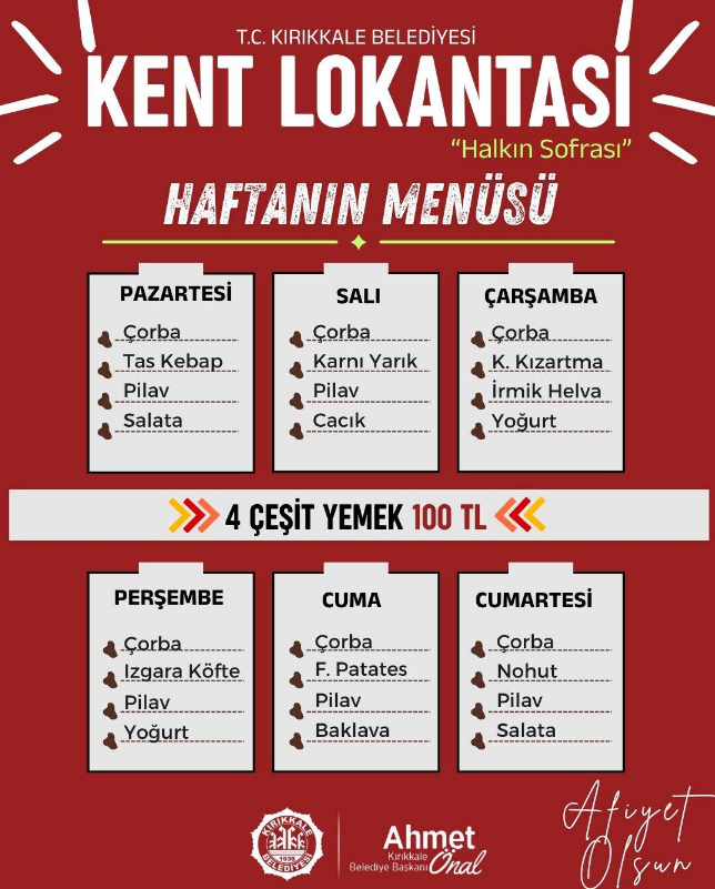 Kırıkkale Belediyesi Kent Lokantası'nda haftalık menü şöyle;