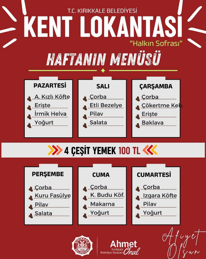 Kırıkkale Belediyesi’ne bağlı olarak hizmet veren Kent Lokantası’nda yeni haftanın menüsü belli oldu. Pazar hariç haftanın her günü hizmet veren Kent Lokantası, 4 çeşit yemeği 100 TL’ye Kırıkkaleli vatandaşlara sunuyor.