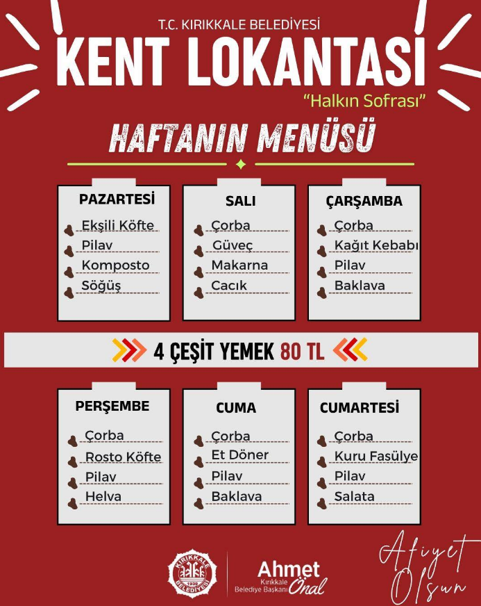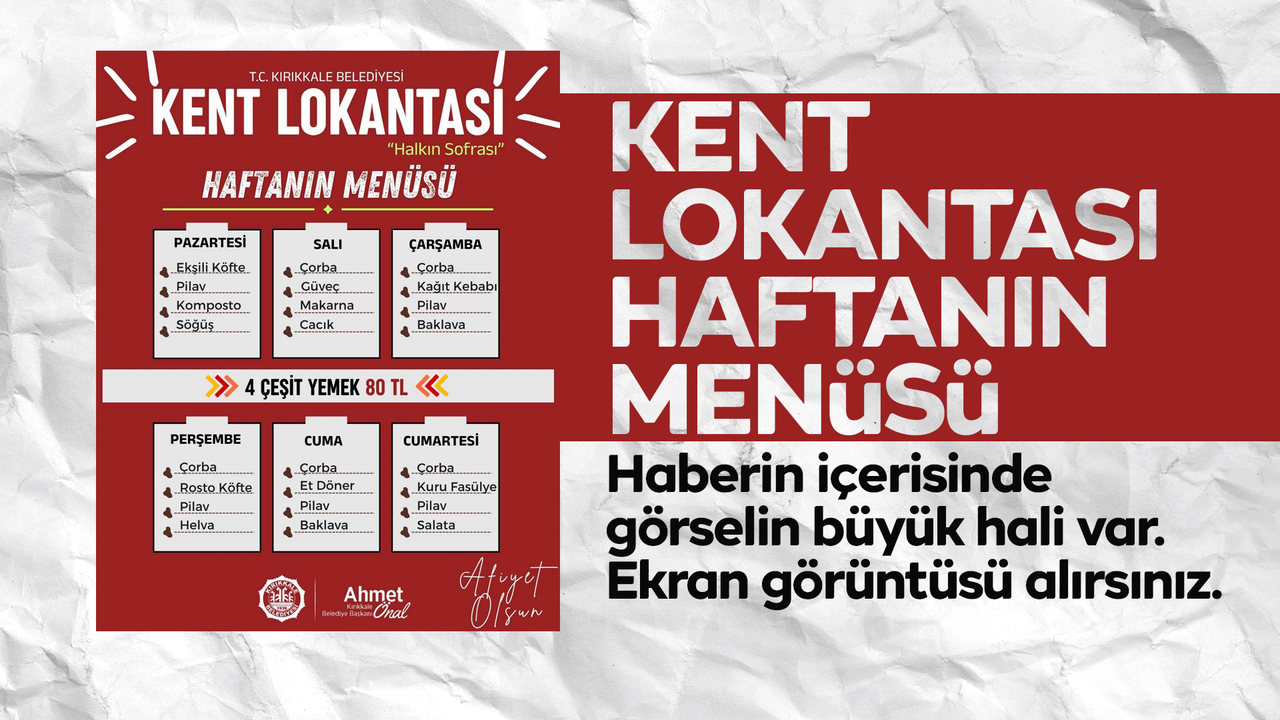 Kırıkkale Kent Lokantası'da haftanın menüsü şöyle;