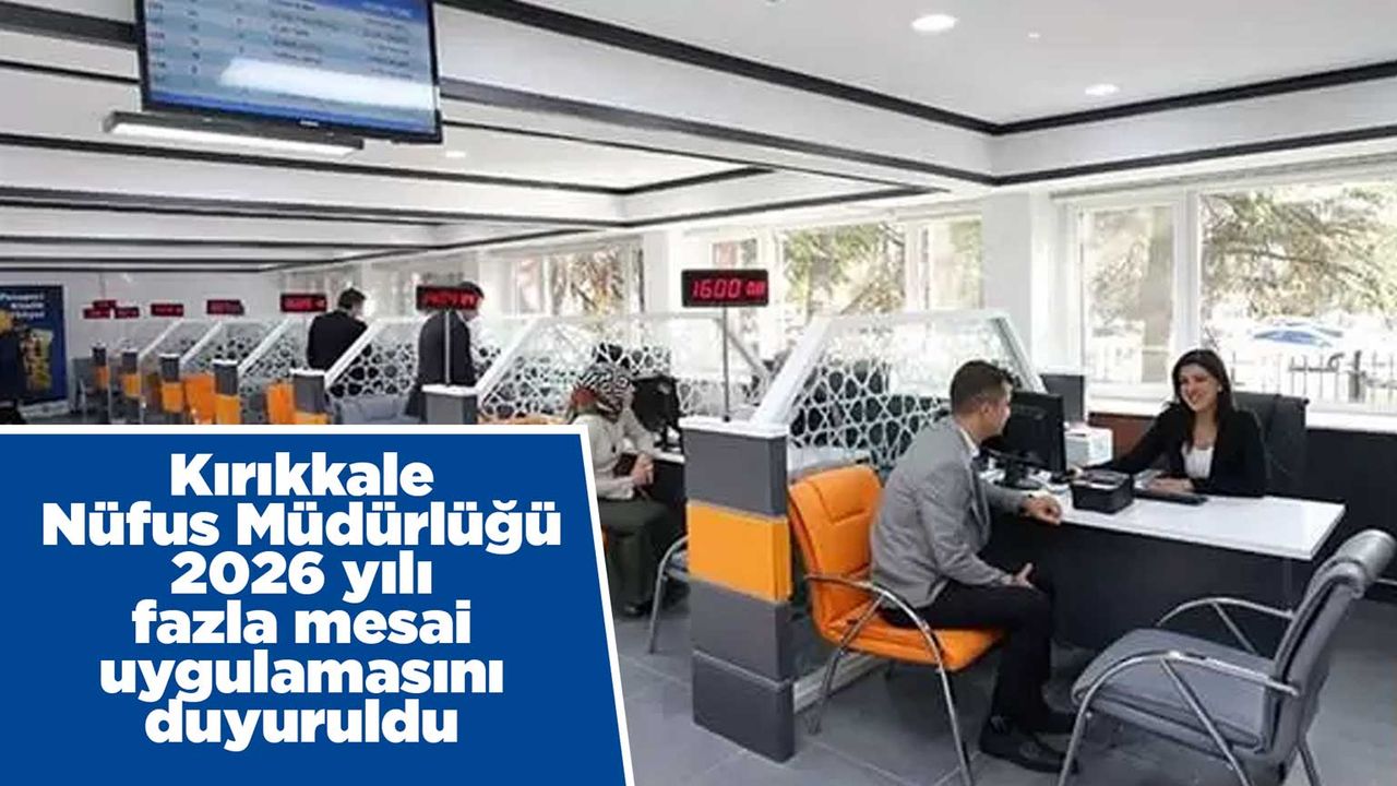 Kırıkkale Valiliği İl Nüfus ve Vatandaşlık Müdürlüğü tarafından yapılan basın duyurusuyla, 2026 yılı boyunca il merkezi ve ilçelerdeki nüfus müdürlüklerinde uygulanacak fazla mesai çalışma düzeni kamuoyuyla paylaşıldı.