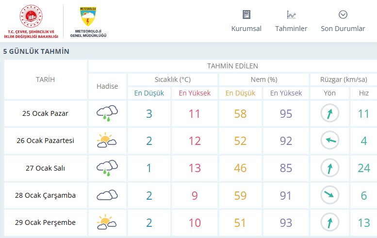 26 Ocak Pazartesi günü parçalı bulutlu bir hava öngörülüyor. En düşük sıcaklık 2 derece, en yüksek sıcaklık 12 derece olarak tahmin ediliyor. Nem oranı yüzde 52–92 aralığında olacak. Rüzgarın hızı ise saatte 4 kilometre ölçülecek.
