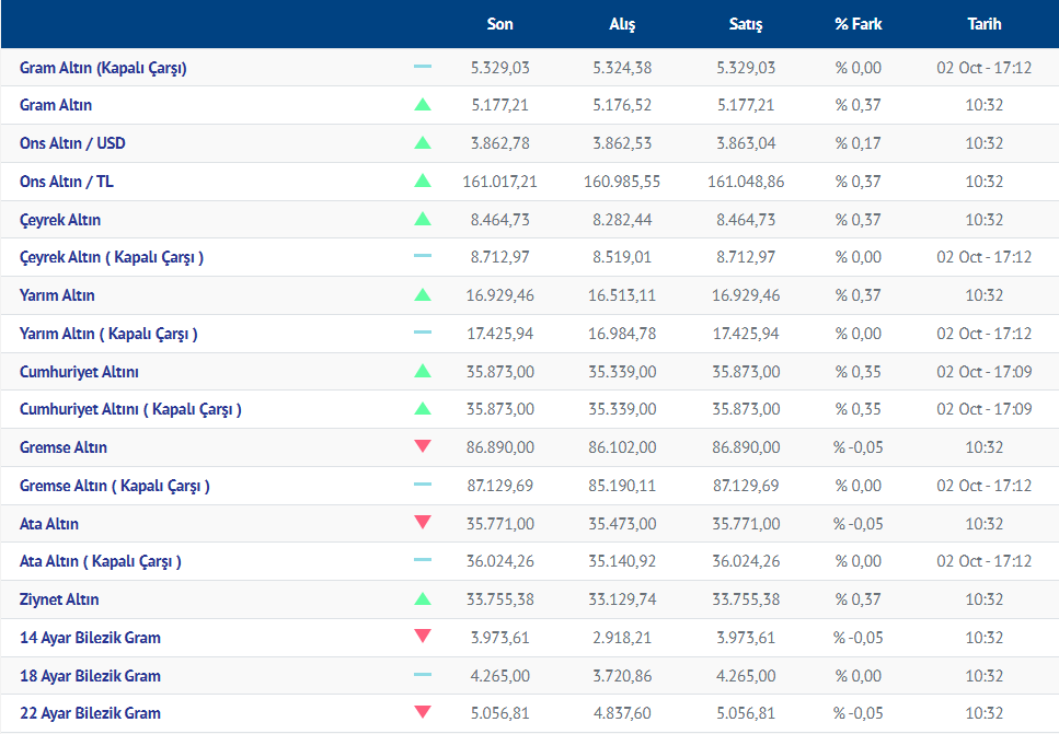 Gram altın yeni güne yükselişle başladı. Güne yükselişle başlayan gram altının bugünkü (03.10.2025) fiyatı, Kırıkkale Kuyumcular Derneğinin verilerine göre, gram altın 5329 liradan işlem görüyor.