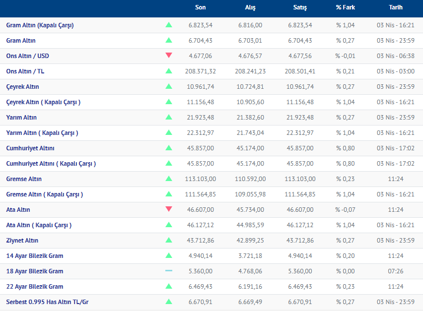 Gram altın yeni güne yükselişle başladı. Güne yükselişle başlayan gram altının bugünkü (03.04.2026) fiyatı, Kırıkkale Kuyumcular Derneğinin verilerine göre, gram altın 6704 liradan işlem görüyor.