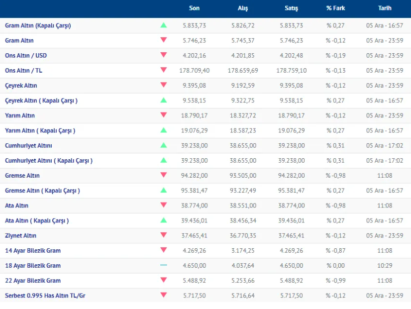 Gram altın dün güne yükselişle başlamıştı. Haftanın son iş gününe yükselişle başlayan altın, güne yükselişle devam etti. Haftayı düşüşle tamamlayan Altının (07.12.2025) fiyatı, Kırıkkale Kuyumcular Derneğinin verilerine göre, gram altın 5,746 liradan işlem gördü. Altının yeni haftaya yükselişle başlaması bekleniyor.