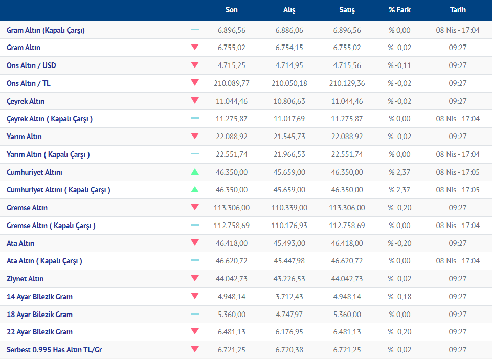 Gram altın yeni güne düşüşle başladı. Güne düşüşle başlayan gram altının bugünkü (09.04.2026) fiyatı, Kırıkkale Kuyumcular Derneğinin verilerine göre, gram altın 6755 liradan işlem görüyor.