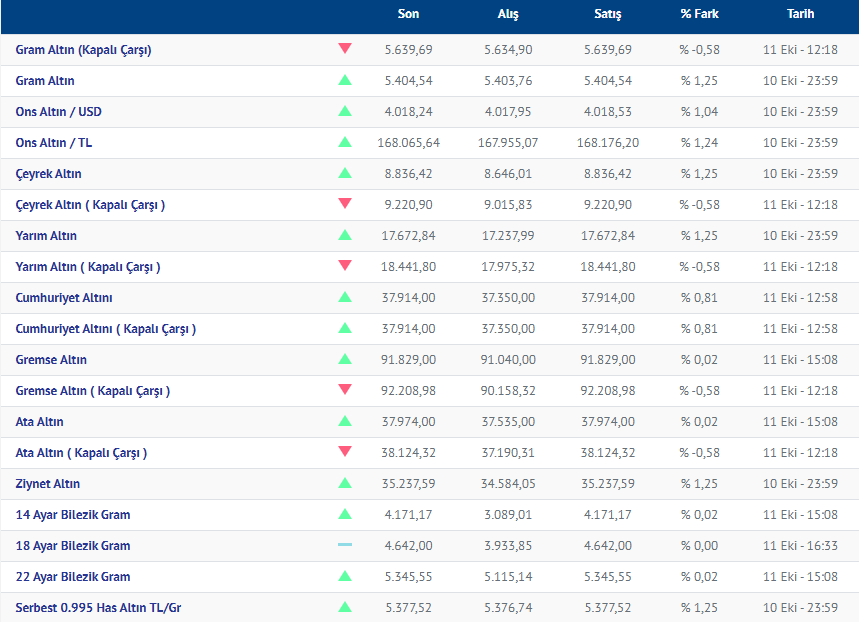 Gram altın dün günü yükselişle tamamlamıştı. Haftanın son gününe düşüşle başlayan altın, güne yükselişle devam etti. Haftayı yükselişle tamamlayan Altının (12.10.2025) fiyatı, Kırıkkale Kuyumcular Derneğinin verilerine göre, hafta sonu piyasalarda hareketlilik yaşanmazken gram altın 5,404 liradan işlem gördü. Altının yeni haftaya da yükselişle başlaması bekleniyor.