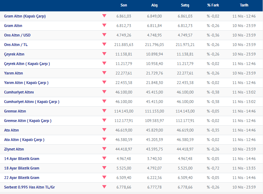 Gram altın dün günü düşüşle tamamlamıştı. Altın, haftanın son iş gününe düşüşle başlayıp, düşüşle tamamlamıştı. Hafta sonu piyasalarda hareketlilik yaşanmazken Altının (12.04.2026) fiyatı, Kırıkkale Kuyumcular Derneğinin verilerine göre, gram altın 6.812 liradan işlem gördü. Altının yeni haftaya yükselişle başlaması bekleniyor.