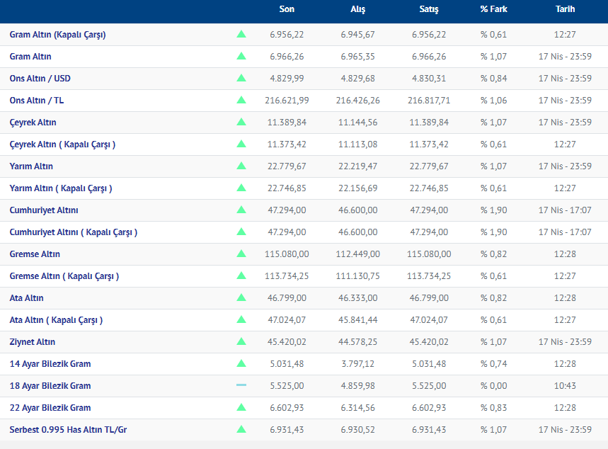 Gram altın dün günü düşüşle tamamlamıştı. Haftanın son iş gününe yükselişle başlayan altın, güne yükselişle devam etti. Güne yükselişle devam eden Altının (18.04.2026) fiyatı, Kırıkkale Kuyumcular Derneğinin verilerine göre, gram altın 6.966liradan işlem görüyor.