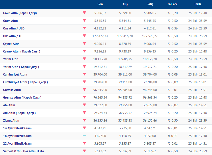 Gram altın dün günü düşüşle tamamlamıştı. Haftanın son iş gününe düşüşle başlayan altın, güne düşüşle devam etti. Hafta sonu piyasalarda hareketlilik yaşanmazken, Altının (26.10.2025) fiyatı, Kırıkkale Kuyumcular Derneğinin verilerine göre, gram altın 5,545 liradan işlem gördü. Altının yeni haftaya yükselişle başlaması bekleniyor