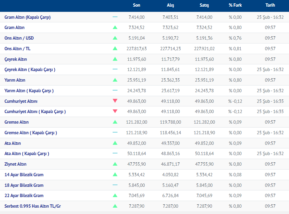 Gram altın yeni güne yükselişle başladı. Güne yükselişle başlayan gram altının bugünkü (26.02.2026) fiyatı, Kırıkkale Kuyumcular Derneğinin verilerine göre, gram altın 7324 liradan işlem görüyor.
