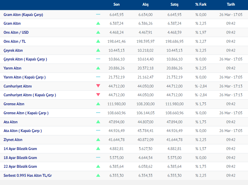 Gram altın yeni güne yükselişle başladı. Güne yükselişle başlayan gram altının bugünkü (27.03.2026) fiyatı, Kırıkkale Kuyumcular Derneğinin verilerine göre, gram altın 6387 liradan işlem görüyor.