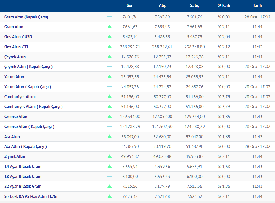 Gram altın yeni güne yükselişle başladı. Güne yükselişle başlayan gram altının bugünkü (29.01.2026) fiyatı, Kırıkkale Kuyumcular Derneğinin verilerine göre, gram altın 7661 liradan işlem görüyor.