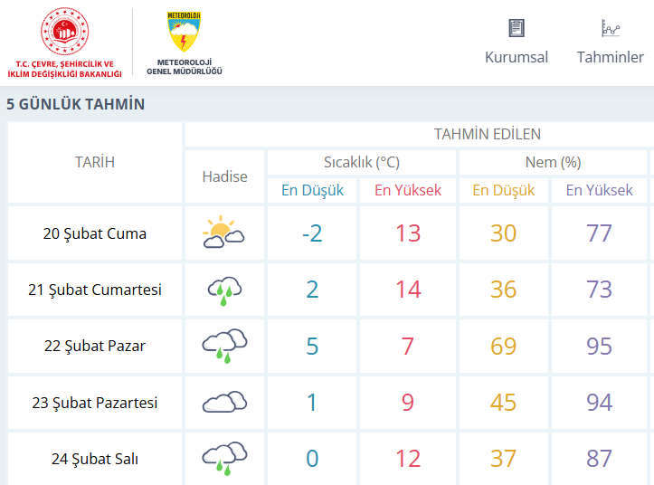 •22 Şubat Pazar günü yağış devam ediyor. Günün en düşük sıcaklığı 5, en yüksek sıcaklığı ise 7 derece olacak. Nem oranının yüzde 95’e kadar çıkması bekleniyor.