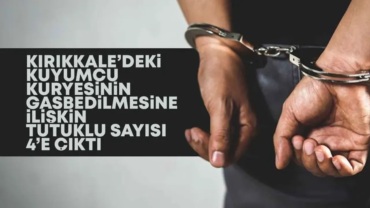 Asayiş Şube Müdürlüğü Cinayet Büro Amirliği ekipleri, Yenidoğan Mahallesi'nde kurye Mesut Aslan'ın altın ve para bulunan çantasının 14 Şubat'ta gasbedilmesiyle ilgili 2 zanlıyı daha yakalandı. Emniyetteki işlemlerinin ardından adliyeye sevk edilen şüpheliler E.E.A ve B.K, çıkarıldıkları hakimlikçe tutuklandı. Yenidoğan Mahallesi Menderes Caddesi'nde 14 Şubat'ta kaldırımda yürüyen kurye Mesut Aslan'ın önünü kesen maskeli 3 şüpheli, tabancayla havaya ateş açarak darbettikleri kuryenin bir miktar altın ve para bulunan çantasını gasbederek otomobille kaçmıştı. Olayın failleri olduğu tespit edilen A.B, M.Y, O.D. ve M.K, Kırıkkale Asayiş Müdürlüğü Cinayet Büro ekipleri ve Ankara polisinin çalışmasıyla Başkent'te yakalanmış, adliyeye sevk edilen şüphelilerden A.B. ve M.Y. savcılıktan serbest bırakılmış, O.D. ve M.K. tutuklanmıştı.