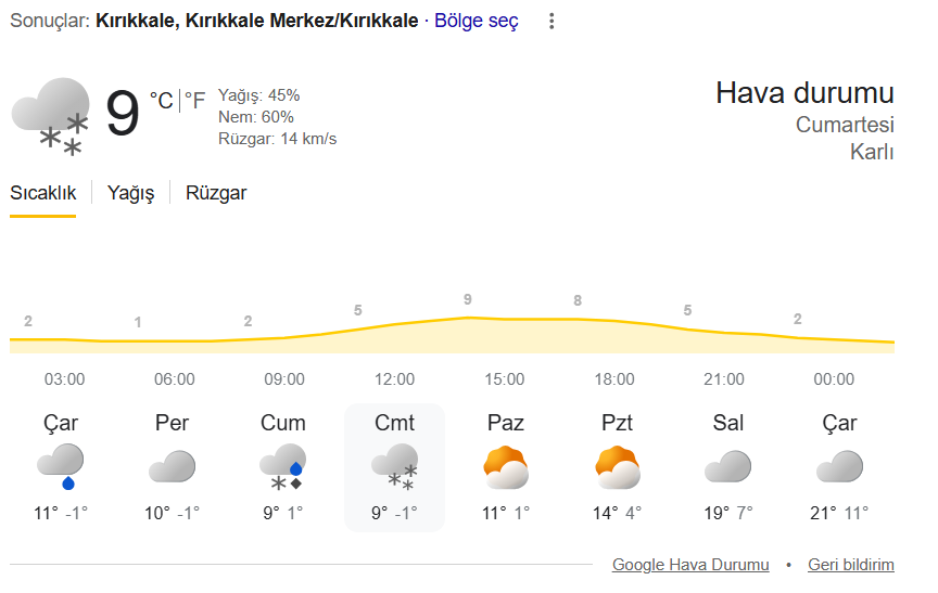 Meteorolojik tahminlere göre cuma günü kent genelinde karla karışık yağmur etkili olacak. Gün içerisinde en yüksek sıcaklığın 9 derece, en düşük sıcaklığın ise 1 derece seviyesinde olması öngörülüyor. Cumartesi günü ise hava sıcaklığının daha da düşmesiyle birlikte kar yağışının görülmesi bekleniyor. Tahminlerde en yüksek sıcaklık 9 derece, en düşük sıcaklık ise eksi 1 derece olarak yer aldı. Hafta ortasında hafif yağmurun etkili olduğu kentte, gece saatlerinden itibaren sıcaklıkların sıfırın altına inmesi beklenirken, vatandaşların özellikle sabah ve gece saatlerinde oluşabilecek buzlanmaya karşı dikkatli olması isteniyor.