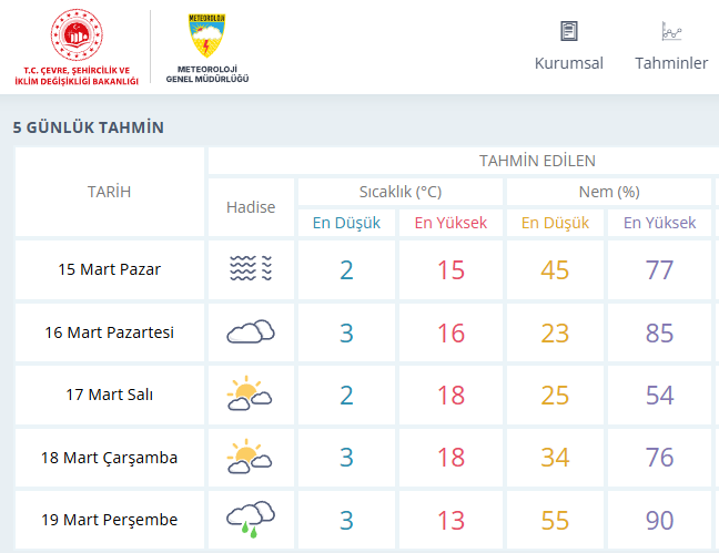 19 Mart Perşembe günü kent genelinde yağmur beklenirken, hava sıcaklığının en düşük 3, en yüksek 13 derece civarında olması öngörülüyor. Nem oranının yüzde 90 seviyelerine kadar çıkacağı tahmin edilirken, özellikle sabah ve akşam saatlerinde yağışın etkisini artırabileceği belirtiliyor. Uzmanlar, sürücülerin kaygan zemin ve görüş mesafesindeki düşüşe karşı dikkatli olması gerektiğini ifade ediyor. Meteoroloji verilerine göre salı ve çarşamba günleri ise hava parçalı bulutlu olacak, sıcaklık 18 dereceye kadar yükselecek. Perşembe günüyle birlikte sıcaklıklarda hissedilir bir düşüş yaşanması bekleniyor.