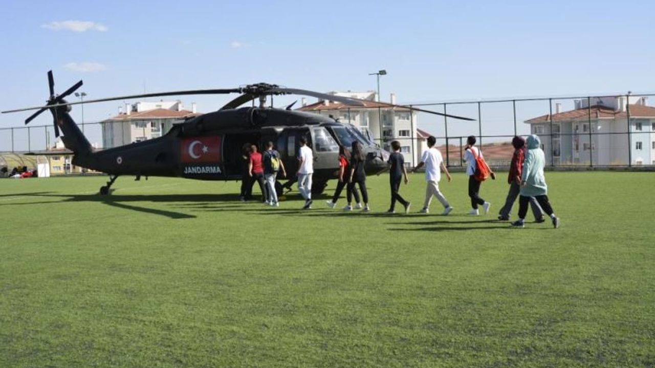 Burada yapılan kontroller ve teknik bilgilendirmelerin ardından aralarında şehit ve gazi çocuklarının da olduğu 100 öğrenci, Jandarma Genel Komutanlığına ait 2 helikopterle şehir turu attı.