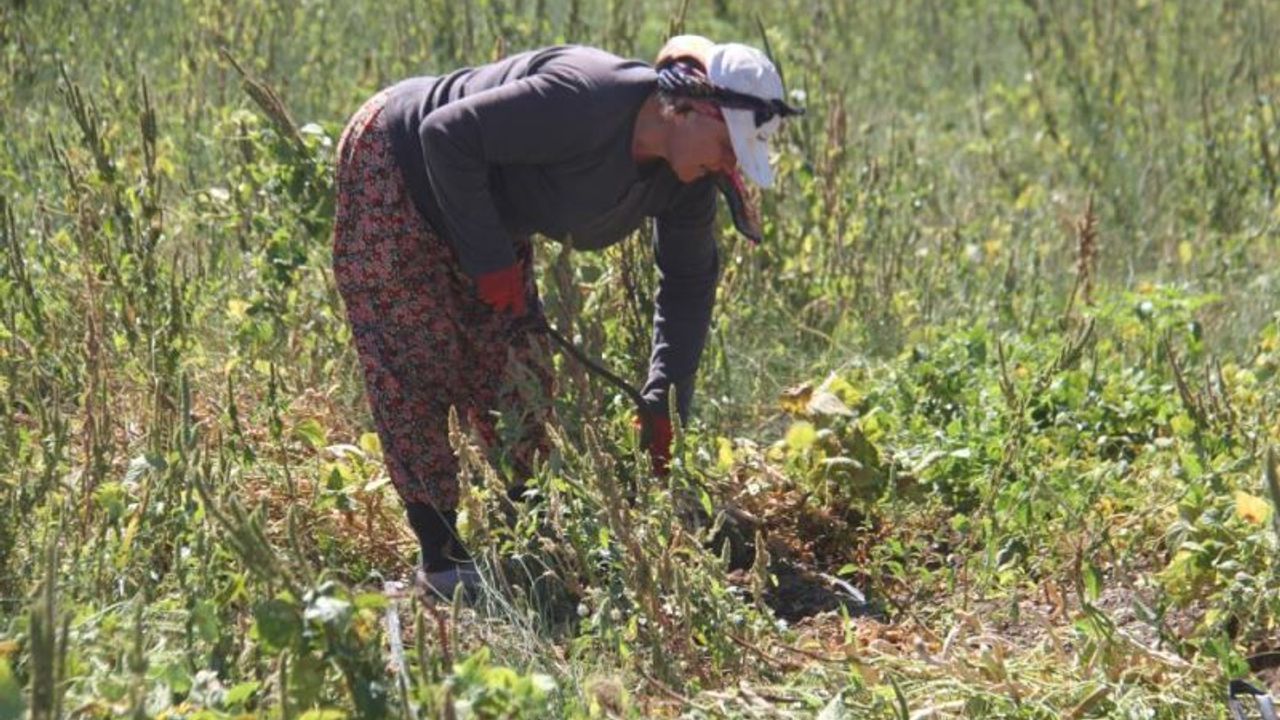 Tarlada fasulye hasadı yapan Meliha Akkaş, geleneksel yöntemlerle yardımlaşarak ürünün hasadını yaptıklarını kaydetti.