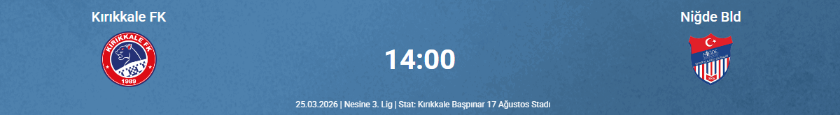 TFF 3. Lig’de mücadele eden Kırıkkale Futbol Kulübü, ligin 26. haftasında Niğde Belediyespor’u konuk edecek. Maç, 25 Mart Çarşamba günü saat 14.00’te Başpınar Stadyumu’nda oynanacak. Kırıkkale Futbol Kulübü’nün mutlak galibiyet parolası ile çıkacağı karşılaşmanın orta hakemlik görevini Yalçın Taşkınfurat, yardımcı hakemlik görevlerini ise Bedirhan Soydemir ve Hakan Dursun üstlenecek.