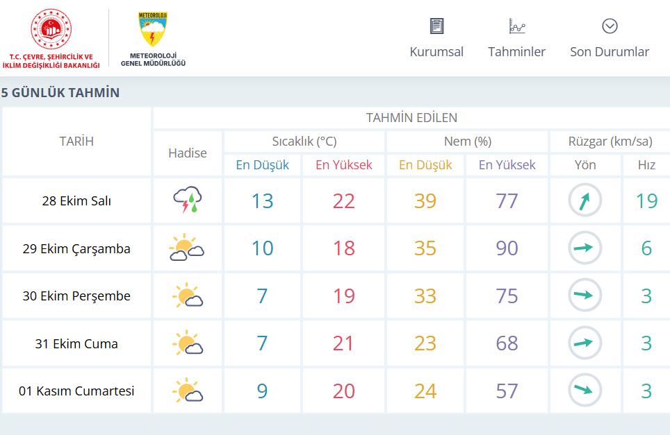 Tahminlere göre en düşük sıcaklık 13°C, en yüksek sıcaklık ise 22°C civarında olacak. Nem oranı %39 ile %77 arasında değişirken, rüzgarın yönü kuzeydoğudan saatte 19 km hızla esecek. Haftanın geri kalanında ise hava, parçalı bulutlu ve açık geçecek. Çarşamba günü sıcaklık 10–18°C, perşembe 7–19°C, cuma 7–21°C ve cumartesi 9–20°C aralığında olacak. Rüzgarın hızı ise 3–6 km/s olarak tahmin ediliyor. Yetkililer, salı günü olası yağış ve rüzgara karşı vatandaşları tedbirli olmaları konusunda uyardı.