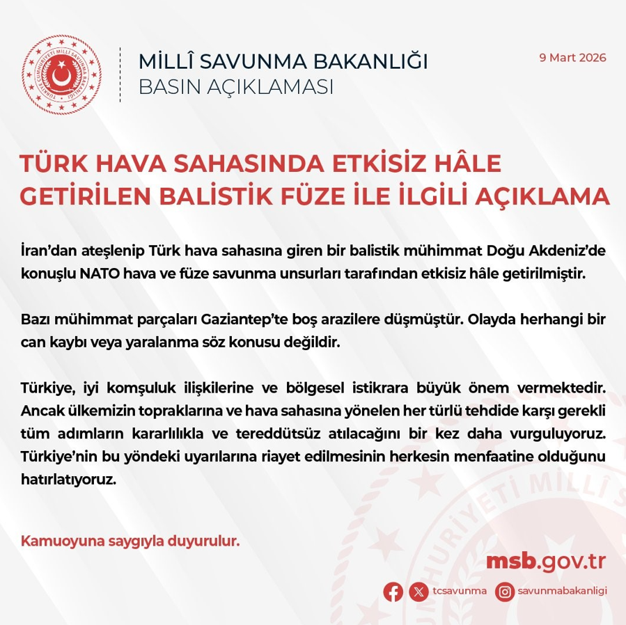 MSB, İran’dan ateşlenerek Türk hava sahasına giren bir balistik mühimmatın Doğu Akdeniz’de konuşlu NATO hava ve füze savunma unsurları tarafından etkisiz hale getirildiğini bildirdi. Bakanlıktan yapılan açıklamada, şu ifadelere yer verildi: "İran’dan ateşlenip Türk hava sahasına giren bir balistik mühimmat Doğu Akdeniz’de konuşlu NATO hava ve füze savunma unsurları tarafından etkisiz hale getirilmiştir. Bazı mühimmat parçaları Gaziantep’te boş arazilere düşmüştür. Olayda herhangi bir can kaybı veya yaralanma söz konusu değildir. Türkiye, iyi komşuluk ilişkilerine ve bölgesel istikrara büyük önem vermektedir. Ancak ülkemizin topraklarına ve hava sahasına yönelen her türlü tehdide karşı gerekli tüm adımların kararlılıkla ve tereddütsüz atılacağını bir kez daha vurguluyoruz. Türkiye’nin bu yöndeki uyarılarına riayet edilmesinin herkesin menfaatine olduğunu hatırlatıyoruz."