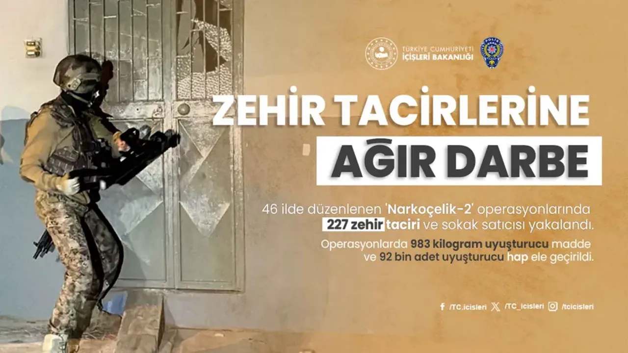 İçişleri Bakanı Ali Yerlikaya, uyuşturucu madde imalatı ve satışını yapanlar ile sokak satıcılarına yönelik 46 ilde düzenlenen Narkoçelik-2 operasyonlarında 227 şüphelinin yakalandığını bildirdi.