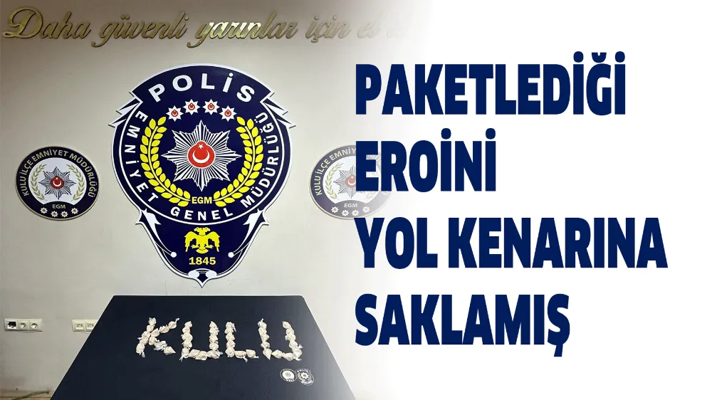Gözaltına alınan şüphelinin yol kenarına farklı noktalara sakladıklarıyla birlikte 800 gram eroin ele geçirildi. Edinilen bilgiye göre, Kulu İlçe Emniyet Müdürlüğü ekipleri, devriye görevi sırasında Katır Tepesi mevkisinde yol kenarında yürüyen sırt çantalı bir şahıstan şüphelendi. Etrafı gözetleyerek yürüyen şüpheliyi bir süre takibe alan polis ekipleri, ismi M.Y.B. olduğu belirlenen kişiyi durdurdu. Şüphelinin yapılan üst aramasında 10, sırt çantasında da 34 parça satışa hazır halde eroin ele geçirildi. Şüpheli yapılan ilk sorgusunda 8 paket eroini yol kenarında farklı noktalara sakladığını itiraf etmesi üzerine arama yapıldı. Yol kenarında farklı noktalarda 8 paket halinde eroin maddesi daha ele geçirildi. Toplam 800 gram eroin ele geçiren polis ekipleri, şüpheli M.Y.B.'yi "uyuşturucu ticareti yapmak" suçundan gözaltına aldı. Yakalanan uyuşturucu tacirinin yol kenarına sakladığı uyuşturucuların videosunu çekip alıcılarına konum atarak satış yaptığı belirlendi.