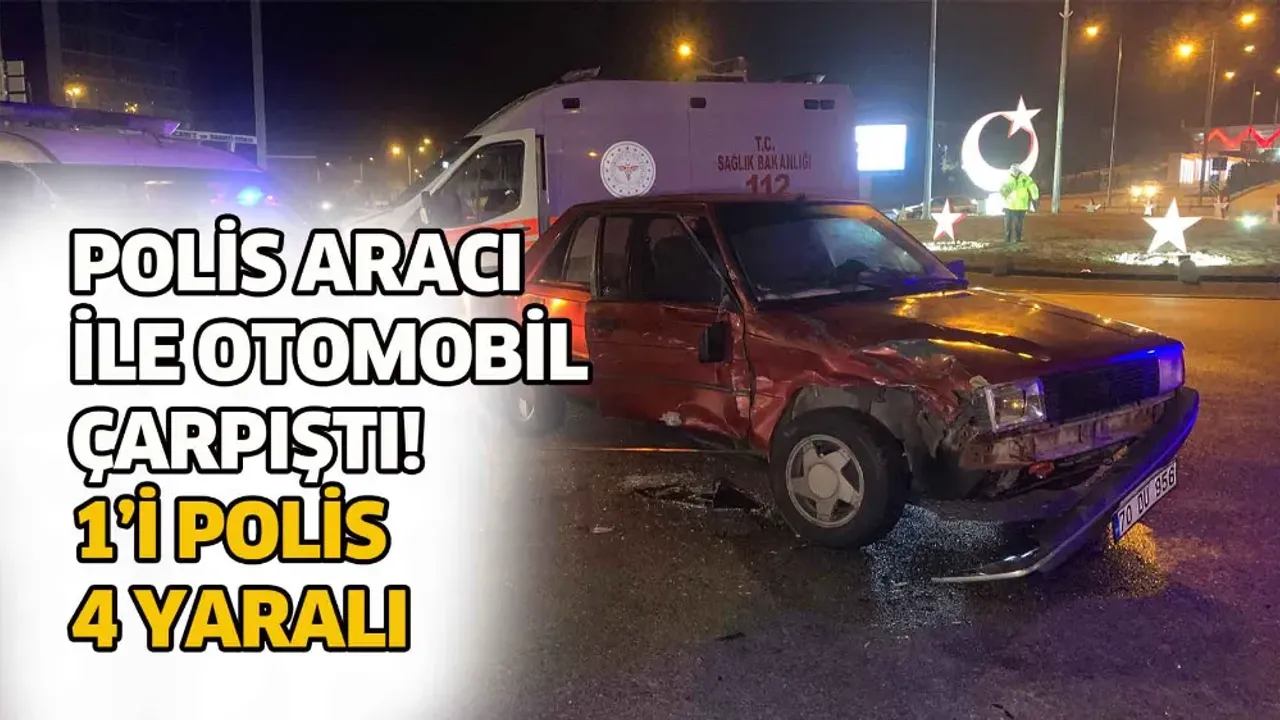 Kaza, akşam saat 20.45 sıralarında Yunuskent Mahallesi Zeytin Dalı Bulvarı üzerinde bulunan valilik kavşağında meydana geldi. Edinilen bilgilere göre, Asayiş Ekipler Amirliğinde görevli G.E. yönetimindeki 70 A 4842 plakalı Fiat marka resmi polis aracı ile M.B. idaresindeki 70 DU 956 plakalı otomobil kavşakta çarpıştı. Kazada polis aracının sürücüsü G.E. ile otomobilde yolcu olarak bulunan Resul Y., Refika Y. ve Emine B., yaralandı. İhbar üzerine olay yerine sağlık ve polis ekipleri sevk edildi. Yaralılar kaza yerine gelen ambulanslarla kaldırıldıkları Karaman Eğitim ve Araştırma Hastanesi’nde tedavi altına alınırken, sağlık durumlarını iyi olduğu öğrenildi. Yapılan incelemenin ardında araçlar çekici ile olay yerinden kaldırılırken, kazayla ilgili soruşturma başlatıldı.