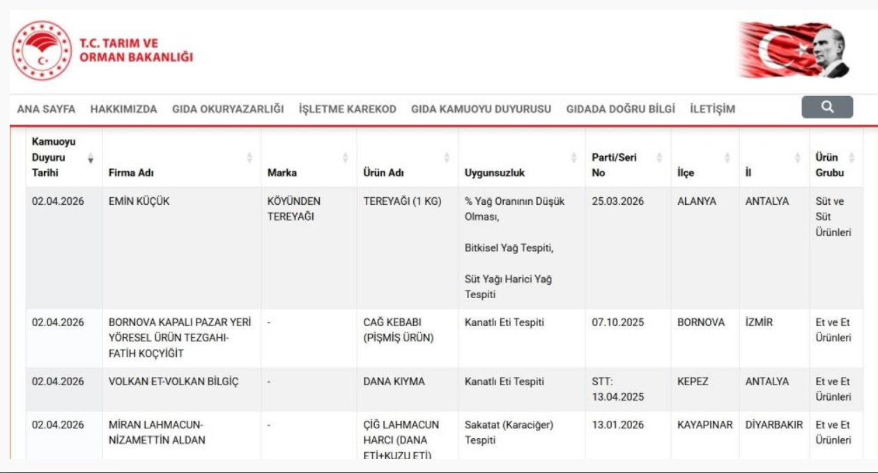 Tarım ve Orman Bakanlığı tarafından vatandaşların sağlıklı ve güvenilir gıdaya ulaşabilmesi amacıyla düzenli olarak güncellenen listelere ‘guvenilirgida.tarimorman.gov.tr’ adresi üzerinden erişilebiliyor.
