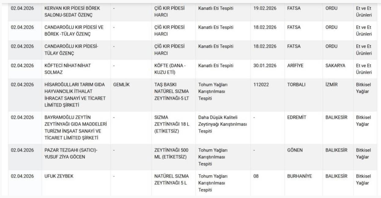 Ordu’nun Fatsa ilçesinde faaliyet gösteren Kervan Kır Pidesi Börek Salonu (Sedat Özenç) ile Candaroğlu Kır Pidesi ve Börek (Tülay Özenç) işletmelerine ait çiğ kır pidesi harçlarında kanatlı eti tespit edildi. Sakarya’nın Arifiye ilçesinde bulunan Köfteci Nihat (Nihat Solmaz) işletmesinin dana ve kuzu etinden hazırlanan köftelerinde de kanatlı etine rastlandığı bildirildi.