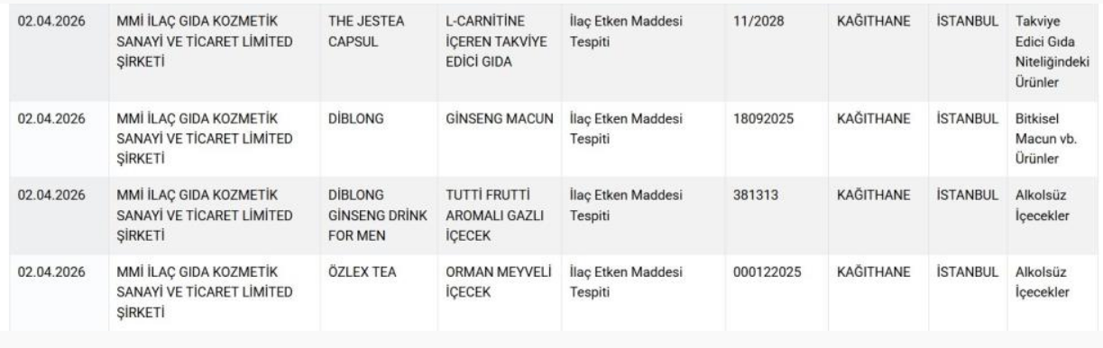 Tarım ve Orman Bakanlığı tarafından kamuoyuyla paylaşılan ‘Taklit veya Tağşiş Yapılan Gıdalar’ listesi güncellendi. 2 Nisan tarihli listede farklı illerde faaliyet gösteren firmalara ait birçok üründe mevzuata aykırılıklar tespit edildi. Listenin ‘Sağlığı Tehlikeye Düşürecek Gıdalar’ kısmında, İstanbul Kağıthane merkezli MMİ İlaç Gıda Kozmetik Sanayi ve Ticaret Limited Şirketi’nde bitkisel veya takviye edici olarak pazarlanan The Jestea Capsul (L-Carnitine içeren takviye edici gıda), Diblong (Ginseng macun), Diblong Ginseng Drink For Men (Tutti Frutti aromalı gazlı içecek), Özlex Tea (Orman meyveli içecek) ürünlerde ilaç etken maddesi tespit edildi. Listenin ‘Aynı Değeri Taşımayan Madde Eklenmesi’ kısmında ise, Antalya’nın Alanya ilçesinde faaliyet gösteren Emin Küçük’e ait ‘Köyünden Tereyağı (1 kilogram)’ ürününde yağ oranının düşük olduğu, bitkisel yağ ve süt yağı harici yağ tespiti yapıldığı belirlendi.