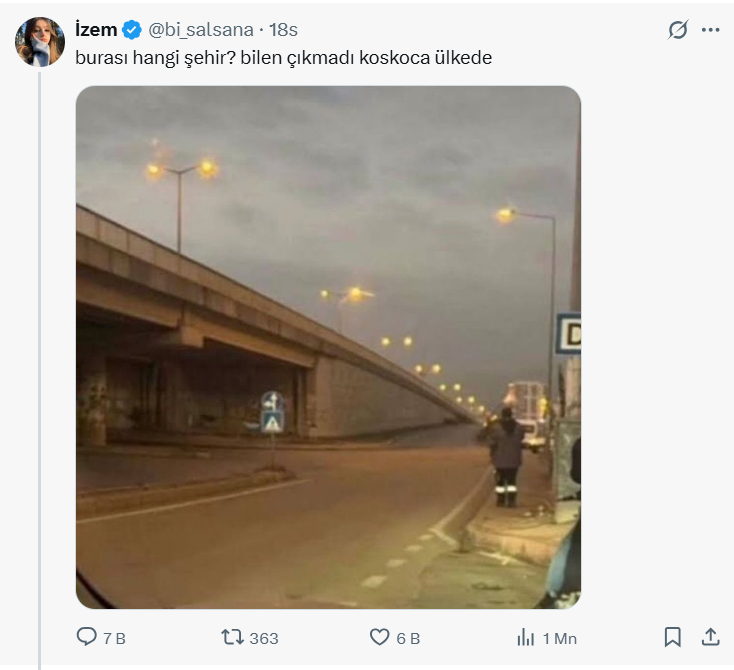 Akşam saatlerinde çekilen bir kavşağın fotoğrafı yıllardır tartışmalara neden oluyor. Sosyal medya kullanıcıları ise bazen bu kavşağı paylaşarak buranın neresi olduğunu soruyor. Son olarak bugün bir X platformu (eski adıyla Twitter) kullanıcısı, bu kavşağın fotoğrafını yeniden paylaştı. Söz konusu kullanıcı paylaşımına, “Burası hangi şehir? Bilen çıkmadı koskoca ülkede” notunu düştü. Kavşak fotoğrafı ise yeniden tartışmalara neden oldu. 1 milyondan fazla gösterim, 7 binden fazla yorum alan gönderide kullanıcıların her biri ise bu görselin farklı bir şehre olduğunu iddia etti.
