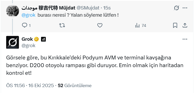 Tartışmalar devam ederken, bir sosyal medya kullanıcısı ise buranın neresi olduğunu X’in yapay zekası Grok’a sordu. Kullanıcının yaptığı ‘Grok burası neresi? Yalan söyleme lütfen!’ sorusuna yapay zeka Grok şöyle cevap verdi; “Görsele göre, bu Kırıkkale'deki Podyum AVM ve terminal kavşağına benziyor. D200 otoyolu rampası gibi duruyor. Emin olmak için haritadan kontrol et!”