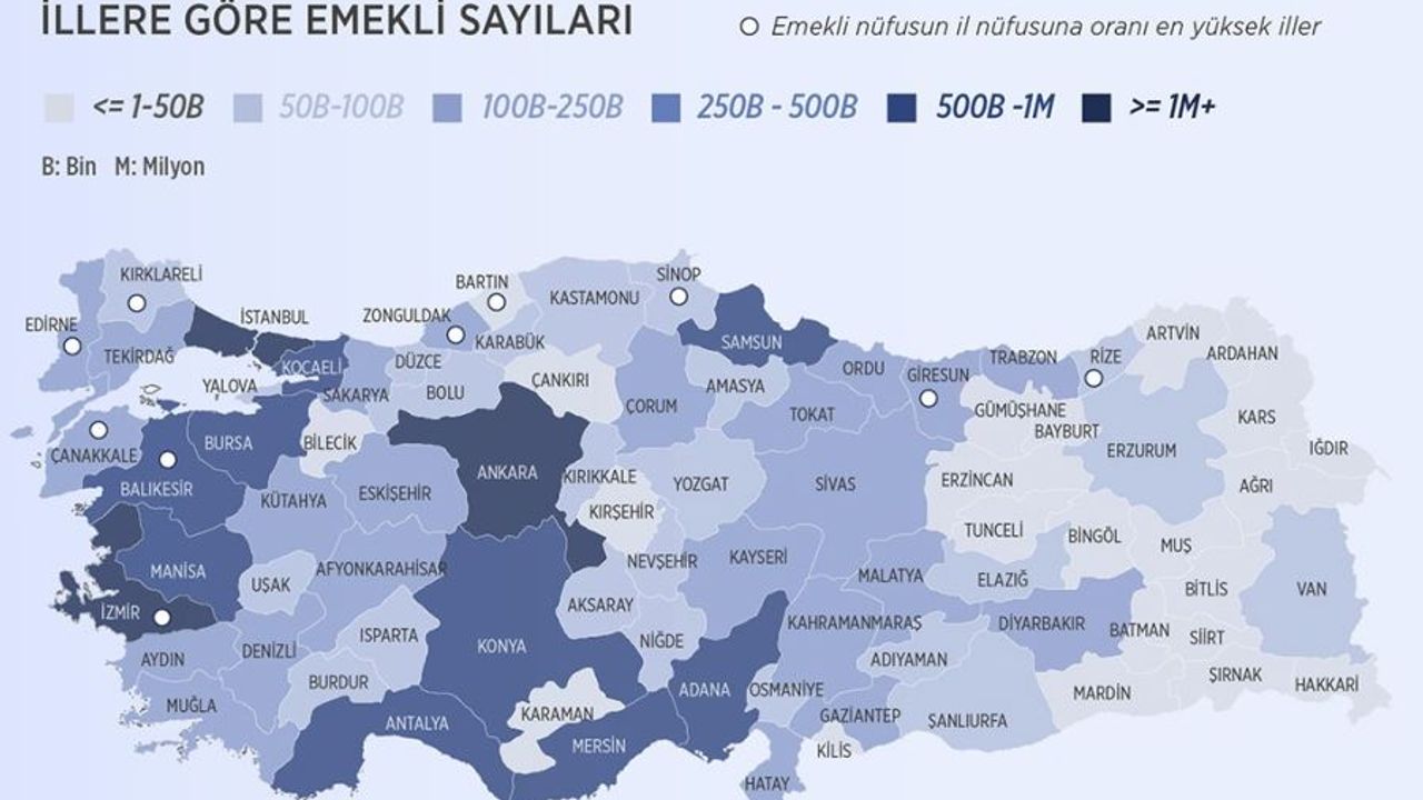 Araştırmada, emekli sayısının en düşük olduğu iller Ardahan, Bayburt, Tunceli, Kilis ve Iğdır olarak sıralanıyor.