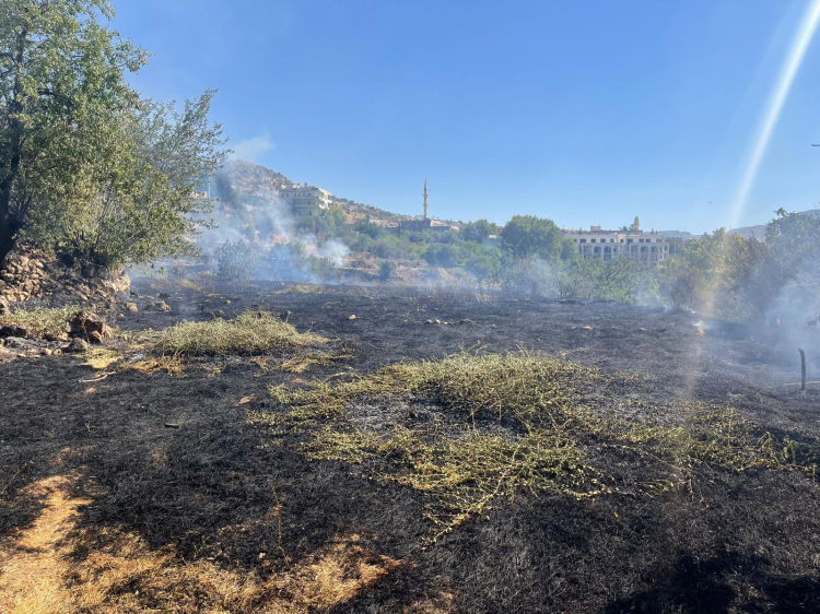 Ev sahipleri ise damda kendi imkanları ile yangın söndürme çalışması yapıyor. Yangında yaklaşık 50 dönüm araz zarar gördüğü ifade edildi. İtfaiye ekipleri bölgede yangını söndürmek için ekipler çalışmalarını sürdürüyor.